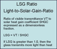 Light-to-Solar-Gain (LSG) ratio is the VT value divided by the SHGC value.