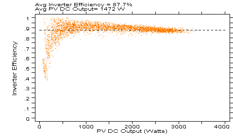 The effect on system power production is minimal, however, since the absolute power produced by the system is low during this period. At 7 PM when the average inverter efficiency drops to 68% the PV system DC output only averages 112 Watts (205 W at 6:45 PM and 43 W at 7:15 PM). This also illustrates an important aspect of the inverter efficiency: the most useful estimate of its efficiency will be based, not on the time-averaged performance of the system, but on the conversion efficiency as weighted by the available DC power. We computed a weighted average inverter efficiency of 89% whereas a time-based average will understate the performance of the power conditioning unit by about 2%. This is because the lowest conversion efficiencies typically occur at low power levels.