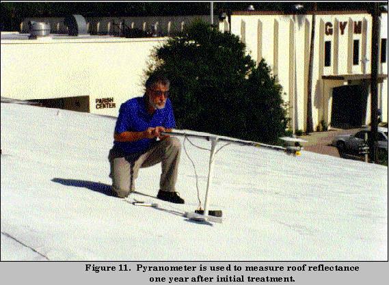 Roof reflectivity measurements used methods developed by previous investigators (Reagan and Aklam, 1979 and Taha et al., 1992). The measurements were made with an Eppley Precision Spectral Pyranometer (PSP) that is sensitive to radiant energy in the 0.28-2.8 nanometer range. The pyranometer has an out output of 8.65 x 10-6 volts per W/m2. The double-dome design of the PSP mitigates the effects of internal convection resulting from tilting the pyranometer at different angles. The PSP is alternately faced up and down to gauge the amount of radiation being reflected from the roof surface. The output of the PSP was recorded on a Fluke 77 Multimeter over a period of approximately 30 seconds. The ratio of the reflected flux measurement to that of the incident solar reading was taken as the reflectivity of the surface.