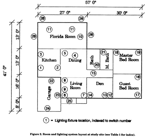 A comprehensive lighting inventory of the house was performed in August of 1995 as summarized in Table 1. The location of the fixtures on a rendering of the house floor plan is shown as Figure 2. The home was found to contain 40 different lamps under 26 controls (switches). In general, the lighting consisted of various incandescent 4-lamps of various sizes. The total connected lighting load was 2.5 kW. Obviously, however, not all lighting is powered at any one time. Thus, a key part of the monitoring protocol was to learn the distribution of "on-time" of both the overall household lighting system, as well as that for individual fixtures. Monitoring of the home in the baseline condition began on April 27th, 1995. A graphical example of 15-minute data collected from the site on September 7, 1995 is shown in Figure 3. In the sample, morning and evening elevations in the measured electric load are clearly visible.