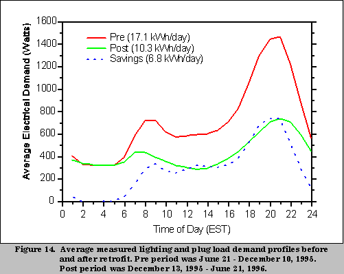 The building was monitored after the retrofit until June of 1996 with the metered lighting and plug loads differenced with those during the pre-retrofit period from June - December of 1995. The measured savings was approximately 6.8 kWh/day-- equal to a reduction in household lighting energy consumption of some 61%. The lighting energy use reduction is highest between 8 and 10 PM. A more conservative savings estimate, (obtained by multiplying the per fixture light logger run hours by the changed lamp wattage), calculated a savings of 5.2 kWh/day (47%) although no estimates were available for the savings of the outdoor lighting system alterations due to difficulties with the exterior light loggers in the post period.