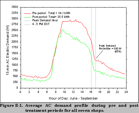 The space cooling energy demand reduction was concentrated during the summer afternoon and early evening hours between 11 AM and 7 PM as seen in Figure E-1. During the utility coincident peak demand period (defined as 4 - 5 PM EST or 5 - 6 PM EDST) the overall electric demand reduction averaged 592 W (from 1469 to 877 W) or 40.3%.